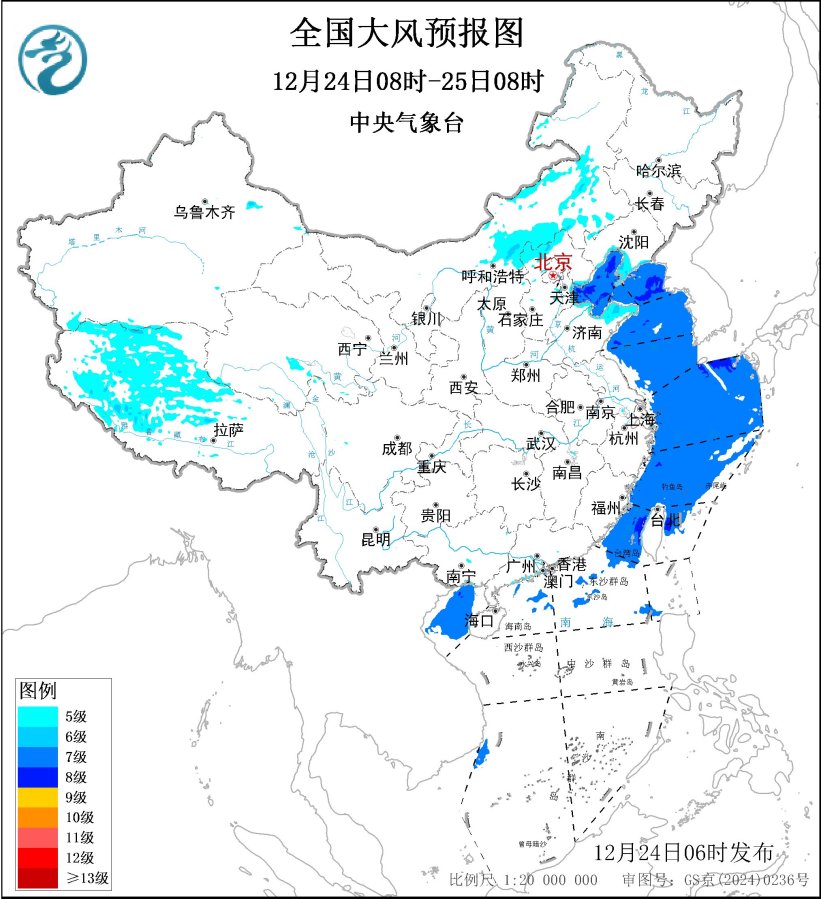 12月25日08时至26日08时,西藏中西部、青海南部、内蒙古中东部、河北北部、辽宁西部和辽东半岛、山东半岛等地有5~6级风,阵风7~8级;渤海、渤海海峡、黄海、东海、台湾海峡、台湾以东洋面、巴士海峡、南海大部海域、北部湾将有7~8级、阵风9~10级的大风,其中,台湾海峡、台湾以东洋面、巴士海峡部分海域风力可达9级、阵风10~11级。