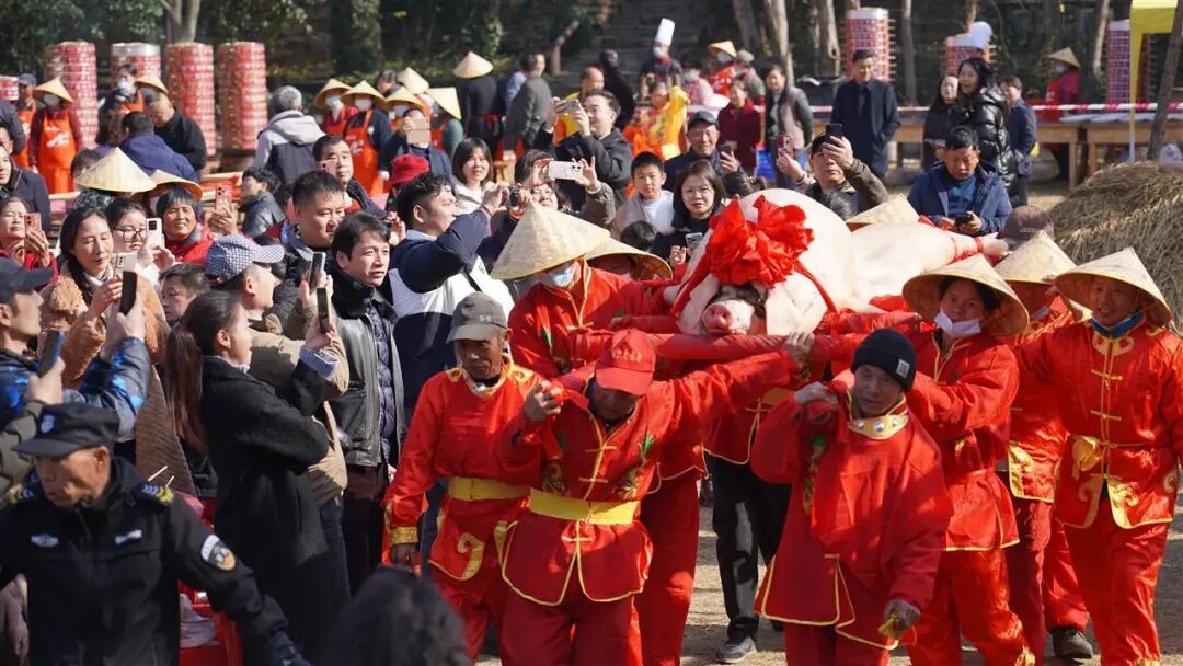 “快看!抬年猪的巡游开始了!”1月3日上午10时许,欢快的锣鼓声穿透景区的热闹人群,数名身着民俗服饰的壮汉抬着刚刚屠宰的本地肥猪稳步前行,肥硕的猪身系着鲜红绸带,在阳光照耀下格外喜庆,引得现场游客纷纷举起手机、相机记录。这道延续百年的民俗仪式,不仅是对自然馈赠的感恩致敬,更精准唤醒了不少长辈深藏心底的童年记忆。