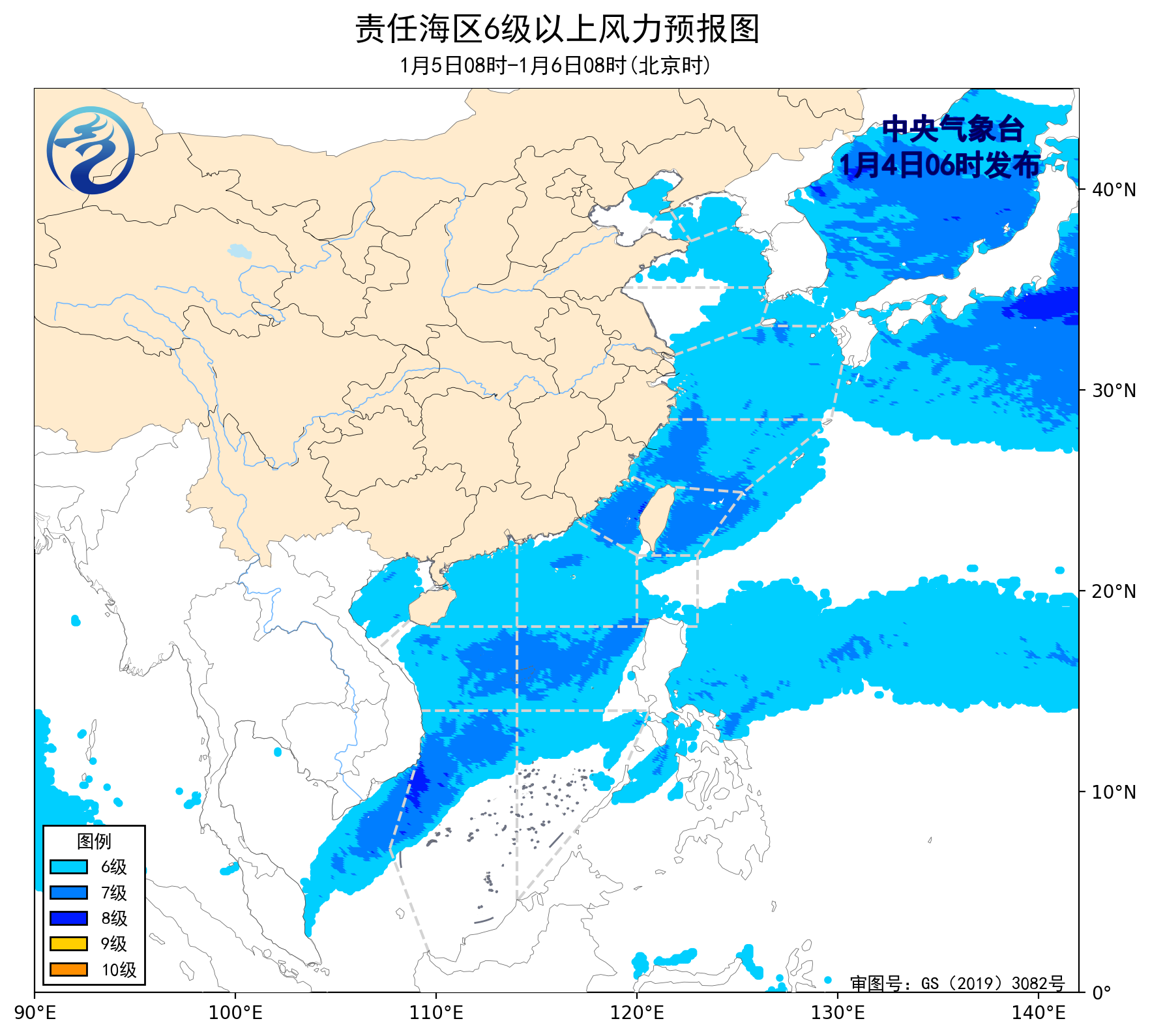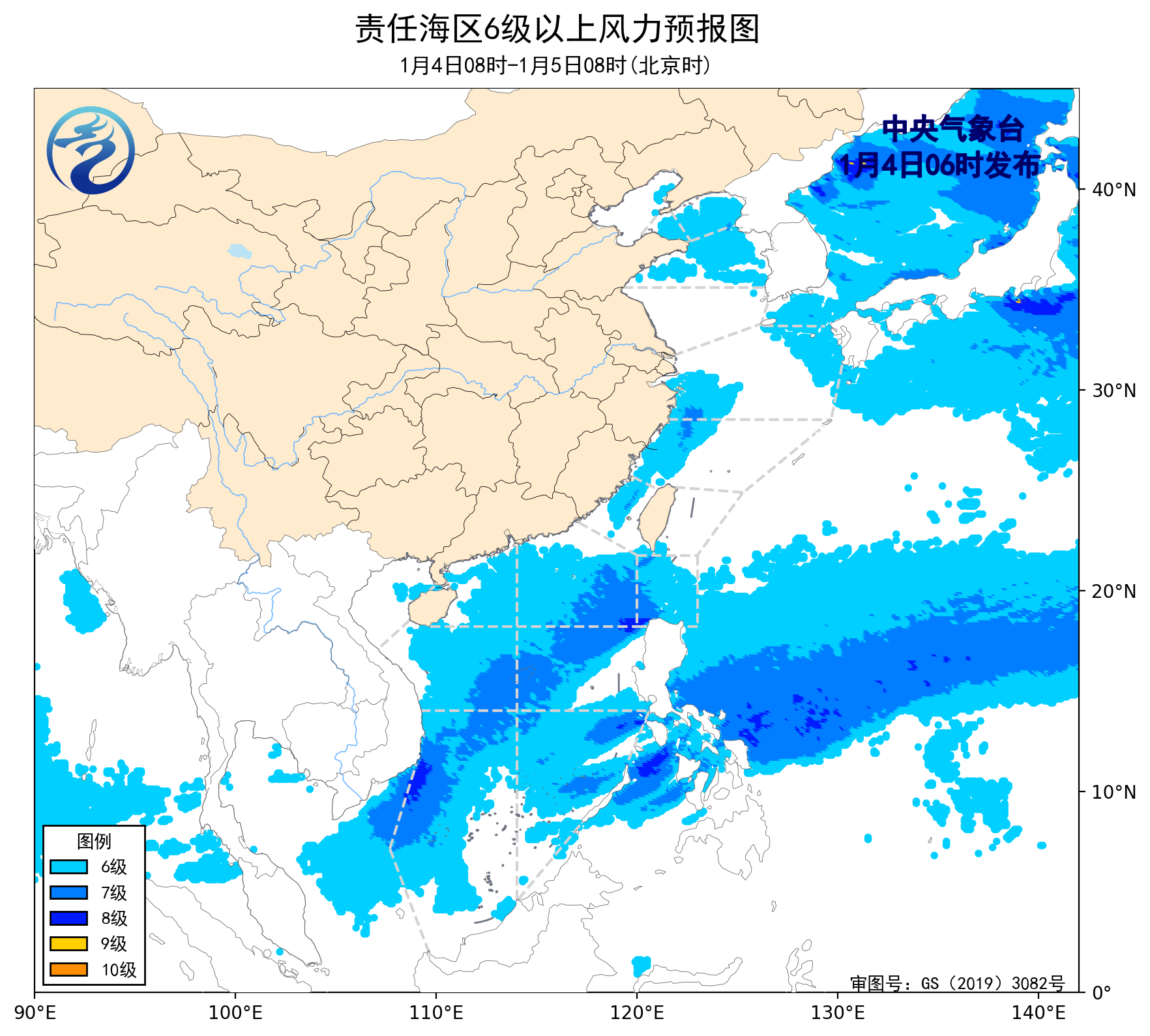 1月3日14时至4日02时,东海北部海域、台湾以东洋面出现了5~6级、阵风7级的东北风或偏北风,台湾海峡、巴士海峡、南海中西部和南部海域出现了6~8级、阵风9级的东北风或偏北风,南海东北部海域出现了7~8级、阵风9级的偏东风,南海西北部海域出现了5~6级、阵风7级的偏东风。