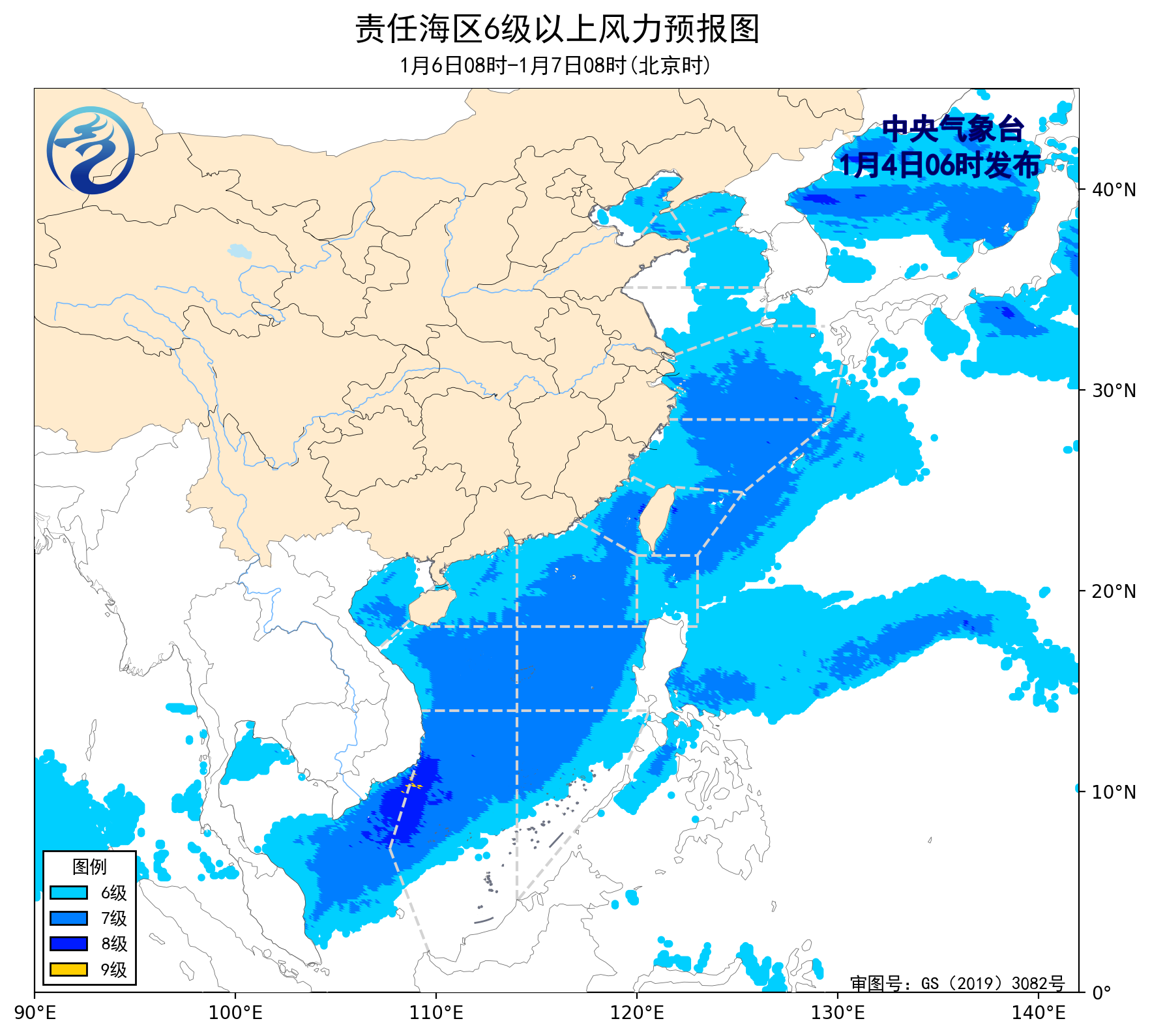 6日08时至7日08时,南海西南部海域将有6~8级、阵风9级的东北风,东海大部海域将有5~7级、阵风8级的偏北到西北风,台湾海峡、台湾以东洋面、巴士海峡、北部湾、南海东部和中西部海域将有5~7级、阵风8级的偏北到东北风,渤海、黄海北部海域将有5~6级、阵风7级的偏西转偏北风,琼州海峡、南海西北部海域将有5~6级、阵风7级的东北风,渤海海峡、黄海中部和南部海域将有4~6级、阵风7级的偏西到西北风。