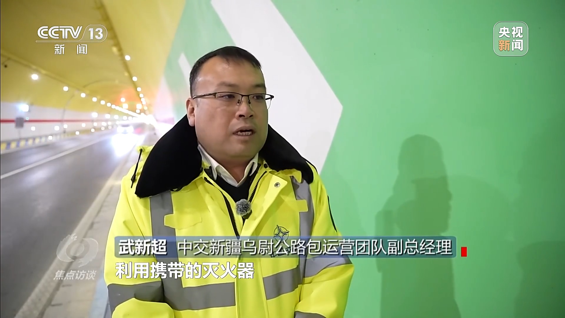 中交新疆乌尉公路包运营团队副总经理 武新超:花了两分多钟赶到现场,交警同志和应急人员利用携带的灭火器,第一时间对火灾进行了控制,整个处置过程用时不到5分钟。