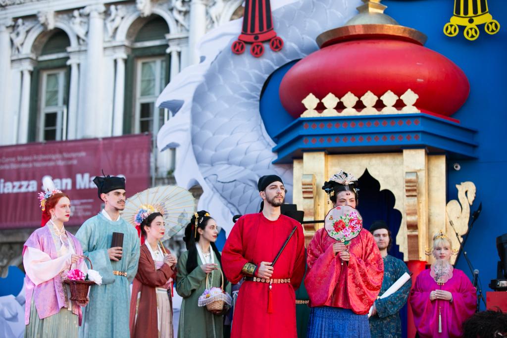 2024年2月13日,在意大利威尼斯,志愿者身着汉服进行表演。新华社记者李京摄